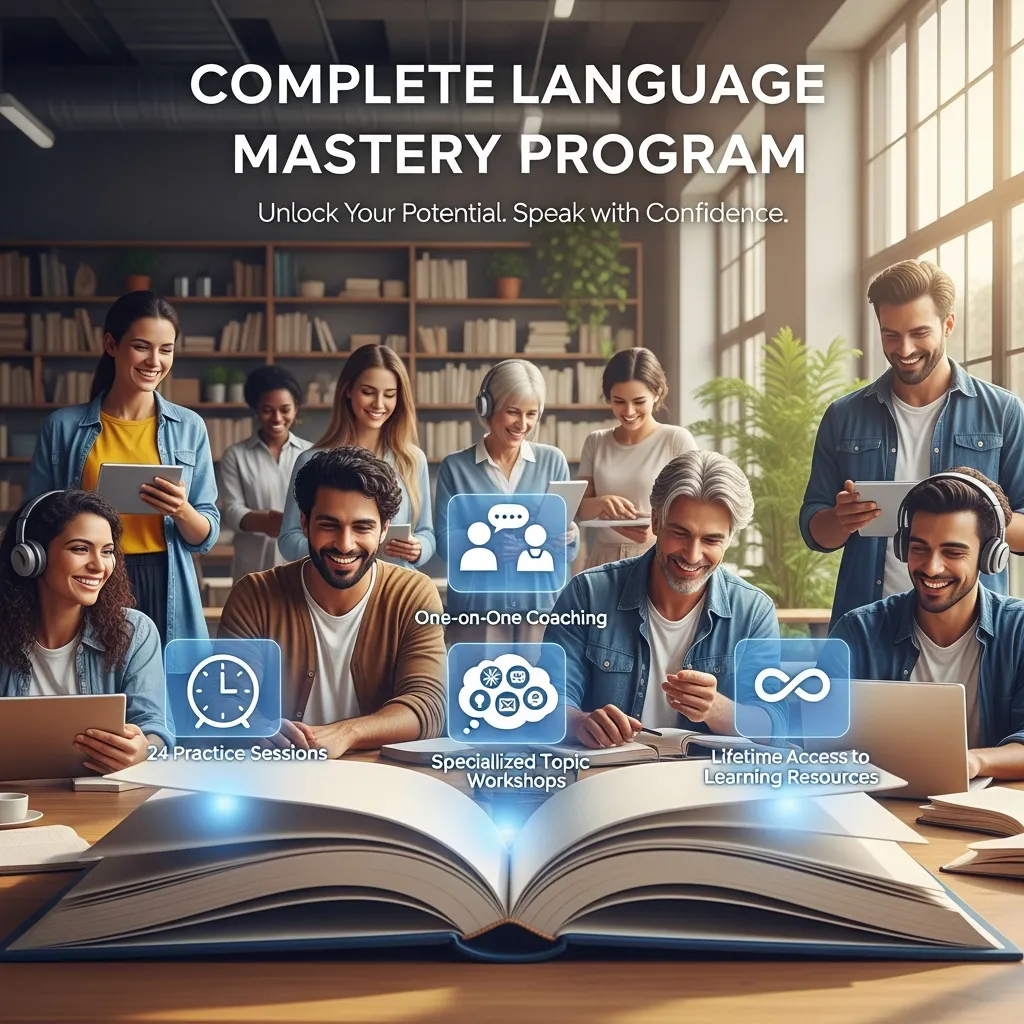 Complete language mastery program with 24 practice sessions, one-on-one coaching, specialized topic workshops, and lifetime access to learning resources.